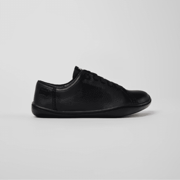 Black leather kids' slip-on shoes with elastic laces, EVA footbeds and rubber outsoles. A Camper Icon that evolves with every season. Peu is functional simplicity inspired by walking barefoot. It is 360-degree stitched and built with a Strobel construction technique, guaranteeing unmatched flex and durability under any conditions.