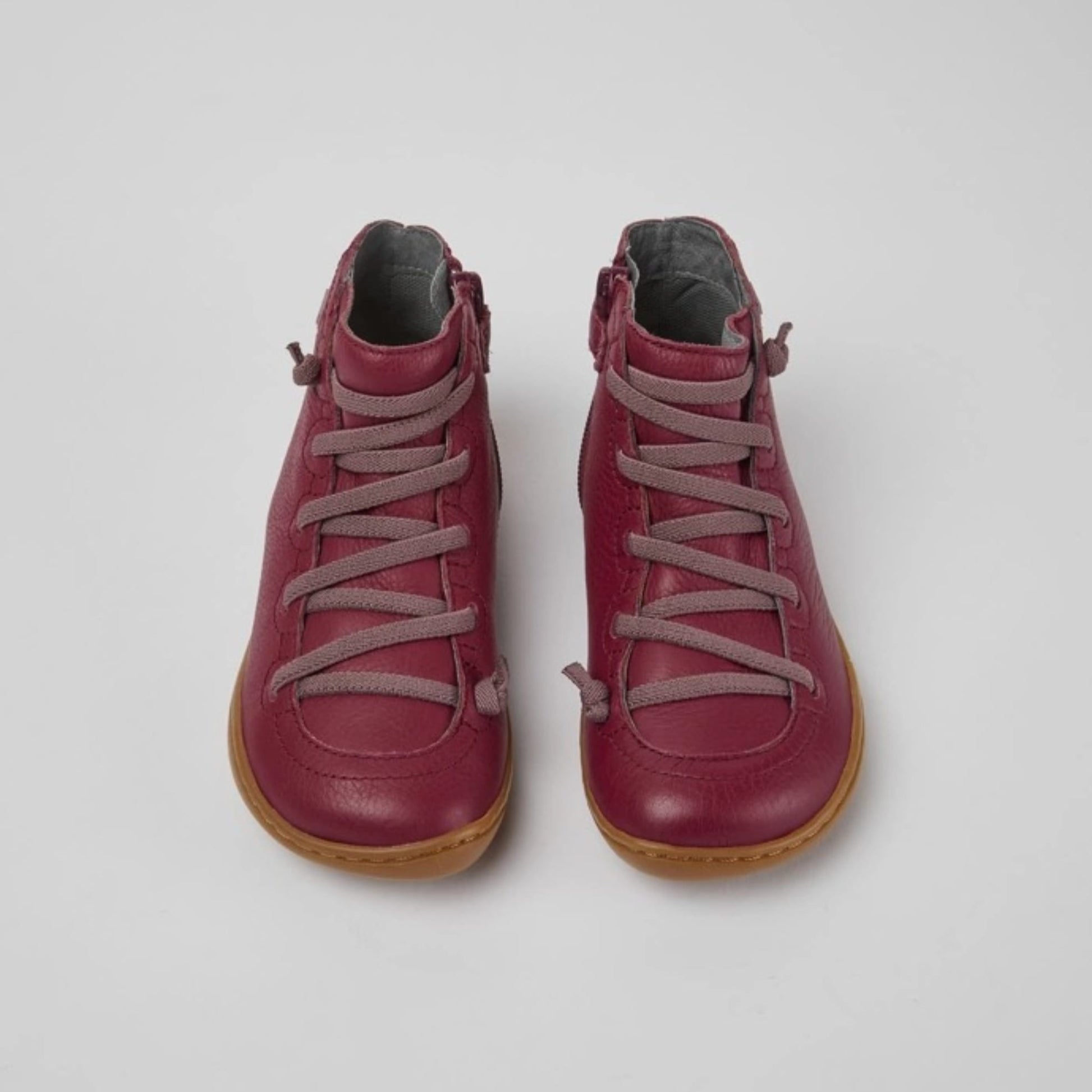 Pink leather zip ankle boots for girls with stitched rubber outsole and 74% recycled PET elastic laces. Better Product: The leather is certified by Leather Working Group, a coalition of brands, suppliers, retailers, leading technical experts, and NGOs aimed at raising environmental standards and ensuring best practice standards for tanners, manufacturers, and retailers. The elastic laces are made of 74% recycled PET in order to eliminate virgin plastic and reduce the carbon footprint emissions all over our supply chain. 20% of the outsole is made of recycled rubber, which helps to scrap waste and reduce the carbon footprint emissions going into a more conscious environmental impact, keeping the same performances and standards of virgin rubber. A Camper Icon that evolves with every season. Peu is functional simplicity inspired by walking barefoot. It is 360-degree stitched and built with a Strobel construction technique, guaranteeing unmatched flex and durability under any conditions.