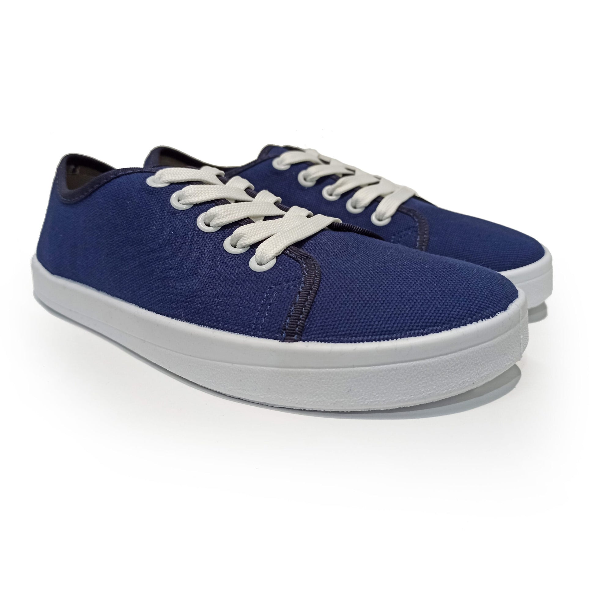 STARTER shoes are built as minimalist shoes with sole pattern as a key attribute. Shoes are built on 6 mm strong thermoplastic rubber sole. Upper made of 2-layer canvas to assure durability, breathability and flexibility. To increase water resistance and dirt resistance we recommend using impregnation sprays. Sneakers are ready for almost every instep height. Sneakers have textile insole with no support. Model A11 is blue fabric colour with white sole.