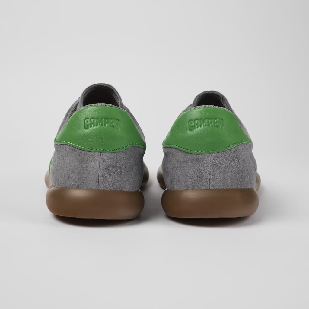 Gray nubuck/leather men's sneakers with lace closures, recycled OrthoLite® footbeds, and rubber outsoles.