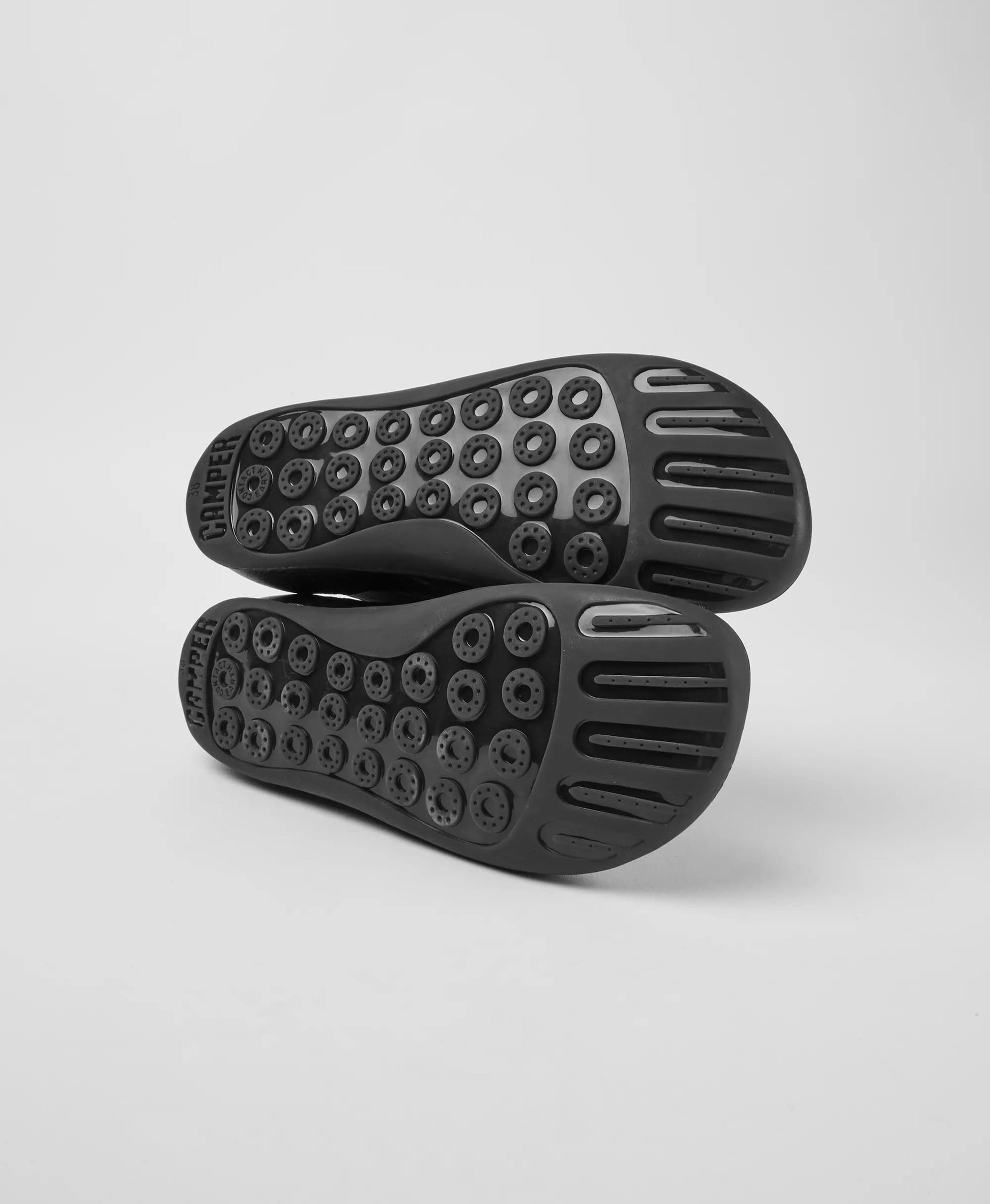 Black leather women's ankle boots with 20% recycled TPU outsoles. A Camper Icon that evolves with every season. Peu is functional simplicity inspired by walking barefoot. It is 360-degree stitched and built with a Strobel construction technique, guaranteeing unmatched flex and durability under any conditions. Our shoes are made with carefully selected, premium materials. The use of the right shoe care products will ensure these styles are protected and will last for a long time. 1. Remove dirt and grime with a soft cloth. 2. Protect leather from dirt and humidity with our Protect & Care Spray. 3. Clean and moisturize leather with our Clean & Care Lotion. 4. For extra protection, apply our Nanopro Waterproofing Spray. This product is exclusively for sale in our retail locations. Find a nearby store Shop locator 5. Nourish leather with our Shoe Cream. Apply a thin coat and allow a few minutes to dry. 6. Polish leather with a cloth. Upper Calfskin (Leather Working Group Certified) Color Black Outsole/Features TPU with extraordinary grip (20% recycled) Lining 64% Pigskin 26% Textile (100% Recycled PET) 10% Textile (84% Recycled PET - 16% Latex)