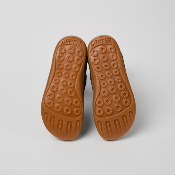 Grey nubuck and leather kids' boots with rubber outsoles (20% recycled). A Camper Icon that evolves with every season. Peu is functional simplicity inspired by walking barefoot. It is 360-degree stitched and built with a Strobel construction technique, guaranteeing unmatched flex and durability under any conditions.