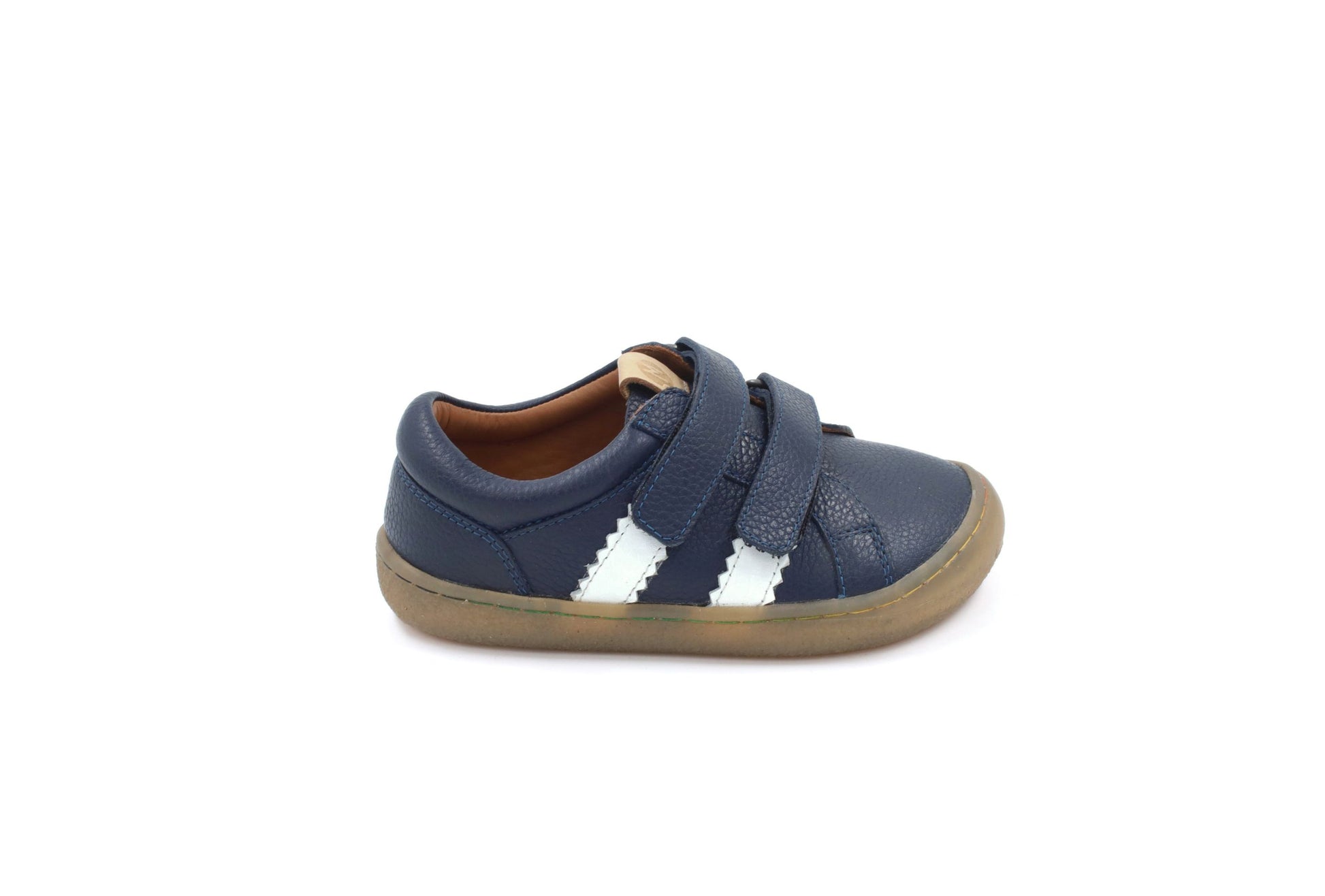 Woodpecker model offers a classic touch with its retro stripe design, adding a bit of old-school charm. Equipped with adjustable velcro straps for a secure, customizable fit and lined with soft leather for added comfort, these sneakers are both functional and stylish. Woodpecker sneakers feature our new barefoot outsole, designed to enhance natural foot movement and provide excellent ground feedback. The wide toe-box ensures ample space for little toes to wiggle and spread, crucial for healthy foot development, while the covered toe enhances durability and offers anti-scratch protection. The outsole is made from super flexible rubber with an anti-slip pattern, ensuring safety during those high-energy playtimes. These sneakers are crafted from high-quality, natural leather, ensuring durability and breathability for comfortable all-day wear. Ideal for playground adventures and daily activities, Woodpecker sneakers blend functionality with style, promoting natural foot movement and development while adding a fashionable touch to your child’s active lifestyle. Features: genuine water repellant leather upper super flexible 4 mm rubber outsole with anti-slip pattern removable 2 mm leather insole semi veg tan leather lining wide toe-box scratchproof toe cover 2 velcro fastening for snug fit natural foot shape for healthy development zero drop without support or cushioning